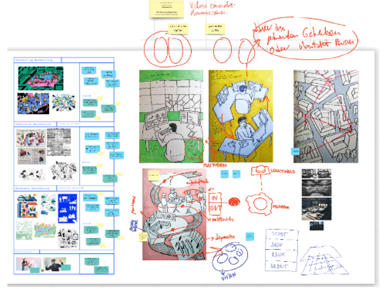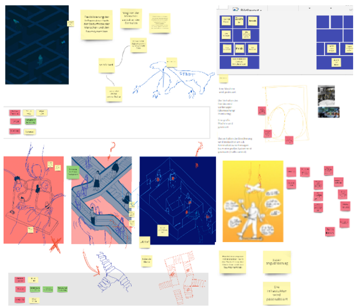 In the second session, Luca presented his associations and drafts to me, which then became the basis for further discussions. His interpretations and sketches brought out new ideas, questions, discrepancies, and gaps in knowledge, which not only led to a constant adjustment of the visualisations, but at the same time to a sharpening and correction of the argumentation. Figure 2 shows a concrete example of the attempts to visualise my findings. In this particular case, I described to Luca how new control centers of urban infrastructure nowadays frame the control of urban space. Following this, metaphorical images such as hot wire, a lift, maze, a puppet, and dressage came up. In the end, none of them were used, but they have still been helpful in sharpening my argument.