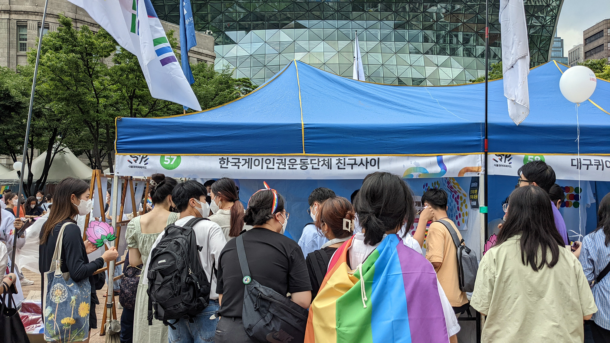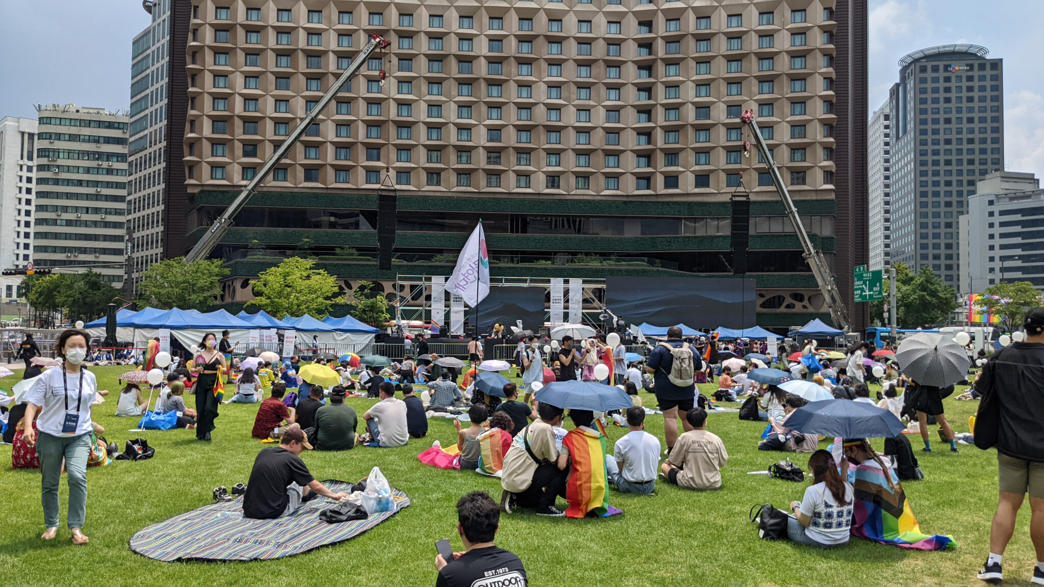 SUG: Seit 2015 wird das Festival dort gefeiert und wurde seither immer populärer, aber die Seouler Stadtregierung ist nicht so angetan davon. Es gibt außerdem großen Widerstand von Christen, die immer zur selben Zeit irgendwelche Veranstaltungen beantragen, um den Ort zu blockieren. So hat die Stadtverwaltung den Platz dieses Jahr nicht wie beantragt für sechs Tage, sondern nur für einen Tag für das Queer Festival freigegeben. Der Platz war an diesem einen Tag dann umstellt von Polizei und umgeben von Gegendemos, die das Festival mit Musik und Reden beschallt haben.