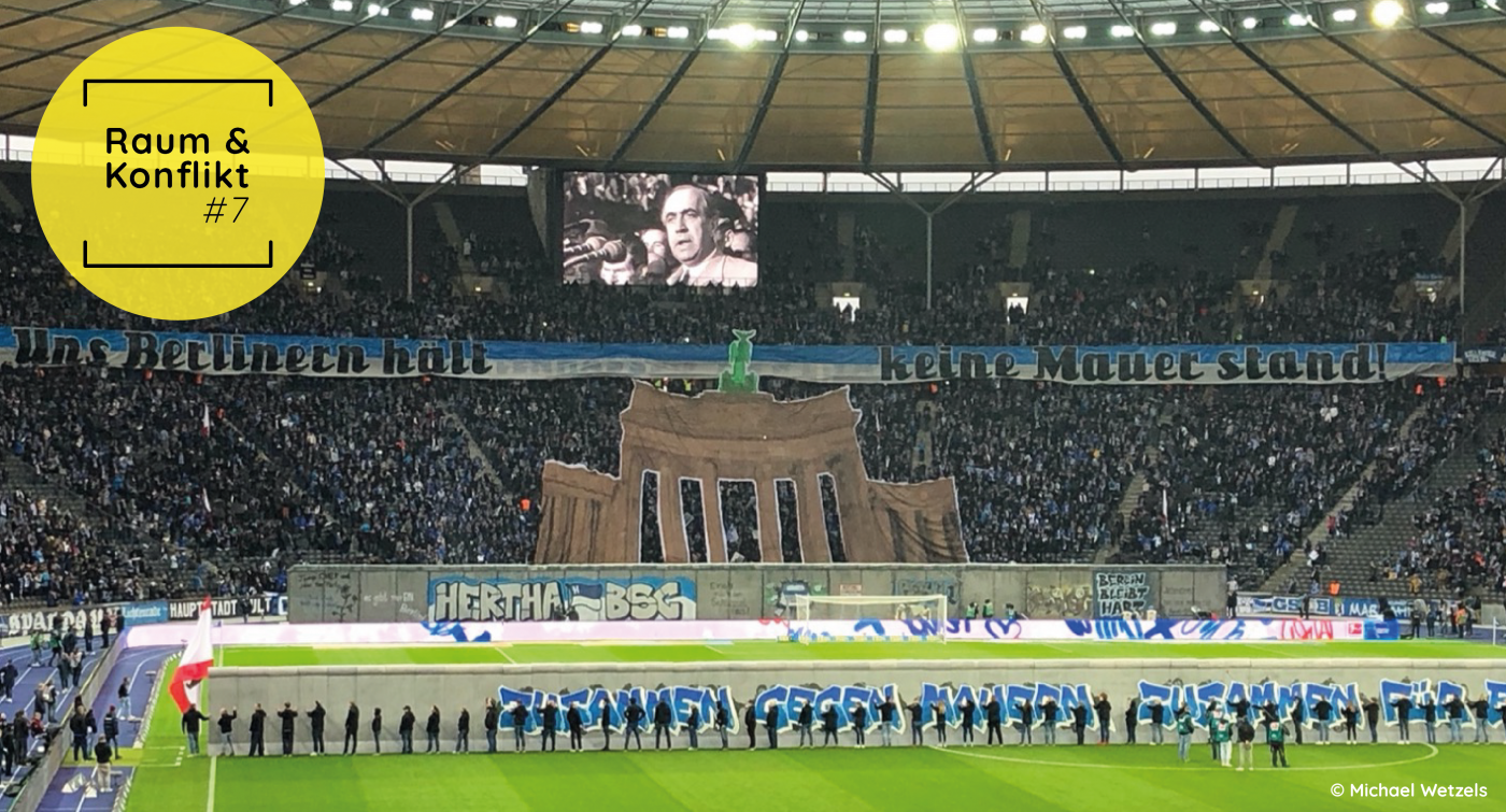 In diesem räumlichen Spannungsfeld bewegen sich die sozialen Kollektiven[7] des Fußballs, die Fans. Konflikt und Konsens sind bei diesen ein schmaler Grat. So werden nicht nur Fans gegnerischer Teams abgewertet, sondern auch den eigenen Reihen kann der Status eines echten »Fans« abgesprochen werden[8]. Dies aber, und hier zeigt sich der schmale Grat, ist nicht unbedingt böswillig, sondern soll markieren, warum gemeinsam an etwas teilgenommen wird, nämlich sich einem bestimmten Team zugehörig[9] zu fühlen. Zugehörigkeit ist dabei nicht nur auf das Stadion beschränkt, sondern sie geht über die Architektur des Stadions hinaus. Sie produziert das, was im Fußball als das Gefühl von »Heimat« verstanden wird. Ob zu Hause spielen, ein Heimspiel haben oder das Stadion als das eigene Wohnzimmer: Stadien bilden einen Konnex mit dem städtischen Raum, indem sie sich befinden. Der städtische Raum aber steht immer unter Spannung. Er verändert sich und mit dieser Veränderung gehen auch die Geschichten verloren, welche sich um ein Viertel und ein Stadion ranken können[10]. Dies musste auch schmerzlich das Kollektiv des Vereins Hertha BSC über die letzten Jahrzehnte erfahren. Der Bannertext im Teaserbild dieses Blogbeitrages »Uns Berlinern hält keine Mauer stand« zeigt dies am wohl berühmtesten Beispiel der jüngeren, deutschen Geschichte: den Fall der Berliner Mauer. Denn diese hatte nicht nur eine große Bedeutung für Deutschland, sondern vor allem für das Hertha-Kollektiv und dessen Geschichte mit dem Olympiastadion. Denn diese Geschichte ist begleitet von vielen Gefühlen: von Freude, Verlust und dem Kampf das zu bewahren, was errungen wurde. Es ist eine Suche nach »Heimat« und nach dem eigenen Selbst, welches geprägt ist von vielen Kontexturen (»polykontextural«).