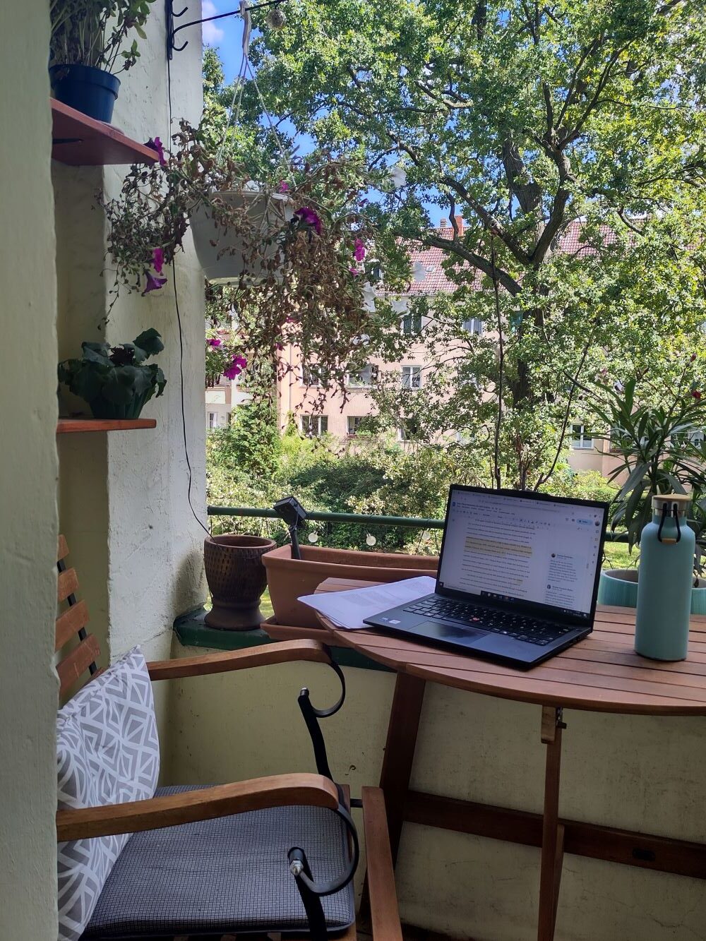 It’s all about the spatial arrangement. My ideal writing setting depends. For a lot of tasks involving literature research or data analysis, I rely on a large second screen, so I need to be at my desk at the office or at home. But when it really just comes down to putting words on the page, I like sitting on my balcony. You can hear the wind in the trees and sometimes there are foxes, bunnies, or racoons in the backyard, so it’s rather idyllic.