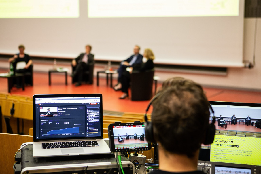 Die Frage danach, was die Soziologie als Wissenschaft zu leisten vermag, aber auch was sie in Anbetracht gesellschaftlicher Entwicklungen können müsste, wie schon im Hintergrund von Séverine Marguins Vortrag angedeutet, leitete auch die zweite Veranstaltung des SFBs 1265 im Rahmens des diesjährigen DGS-Kongresses ein. Am Abend des 17. September 2020 fand die einzige Präsenzveranstaltung der Konferenz im großen Hörsaal der TU Berlin statt. Auf Grund der Corona-Auflagen war die Zahl der vor Ort Teilnehmenden zwar auf ca. 25 Personen begrenzt. Gleichzeitig verfolgten jedoch bis zu 400 Interessierte über den YouTube LiveStream die Impulsvorträge von Hartmut Rosa (Friedrich-Schiller Universität Jena), Andreas Reckwitz (HU Berlin) und Martina Löw (TU Berlin) sowie die anschließende Podiumsdiskussion. Die von Hubert Knoblauch (TU Berlin) organisierte und von Silke Steets (FAU Erlangen) moderierte Sonderveranstaltung stand unter dem Titel „Gesellschaft unter Spannung – Sonderveranstaltung zu soziologischen Diagnosen der gegenwärtigen Um_Ordnungen mit oder nach Corona“ und fokussierte entsprechend das diagnostische Potential der Soziologie. Dabei ging es in der Gegenüberstellung der unterschiedlichen gesellschaftstheoretischen Überlegungen der einzelnen Diskutant*innen nicht nur um die Analyse einer Gesellschaft, die sich mit einer global verbreiteten Pandemie konfrontiert sieht, sondern auch um eine Reflexion über die Möglichkeiten, Ansprüche und Begrenzungen soziologischer Zeitdiagnosen im Allgemeinen – einer, wie Silke Steets dies formulierte, „Soziologie der soziologischen Zeitdiagnose“.