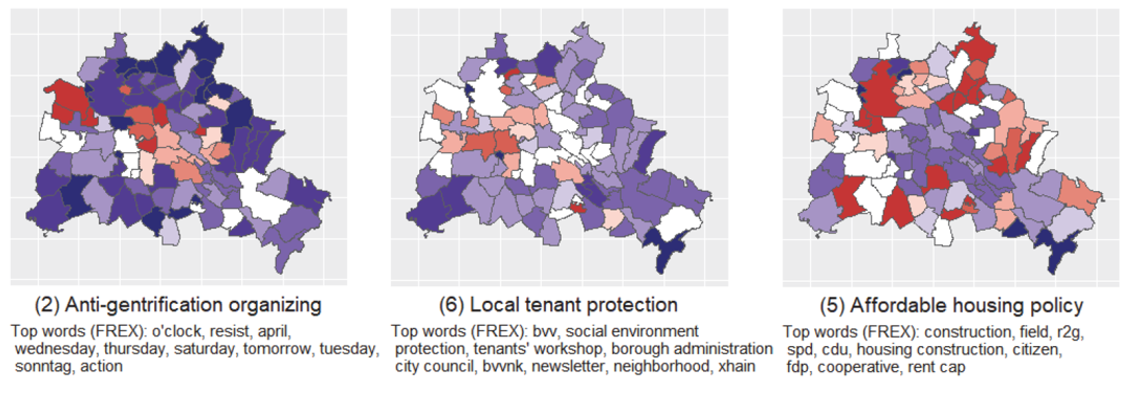 In total, ten sub-issues were found in the Berlin housing Twitter data. Figure 2 shows three examples, which illustrate overall patterns well.7 As shown in the map of Topic 2, which consists of tweets about anti-gentrification protests, sub-issues around activism are strongly clustered in the urban center. This is consistent within topics ranging from squatting activism, to larger protest campaigns, and local struggles around particular buildings. Activism is very much a seen as a phenomenon of the city center in the digital sphere.