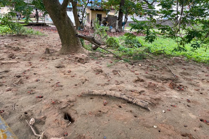 The impressive modernist architecture of most faculty buildings is anything but accessory to the experience of walking I am struggling to re-evoke. A fellow of the Shared Africa Heritage and of the WITS-UniLag-TUB Urban Lab spontaneously talked us through the history of the modernist faculty buildings, the incorporation of natural lighting and ventilation into the architecture, the tessellated designs covering some façades, all while we walked along winding paths between bits of concrete pavement and on ground curiously covered in holes. It was with great surprise that I realized that the holes were the landscape from which hundreds of red claw crabs were following our moves attentively—adding the other-than-human to the palimpsest of affects experienced while walking.