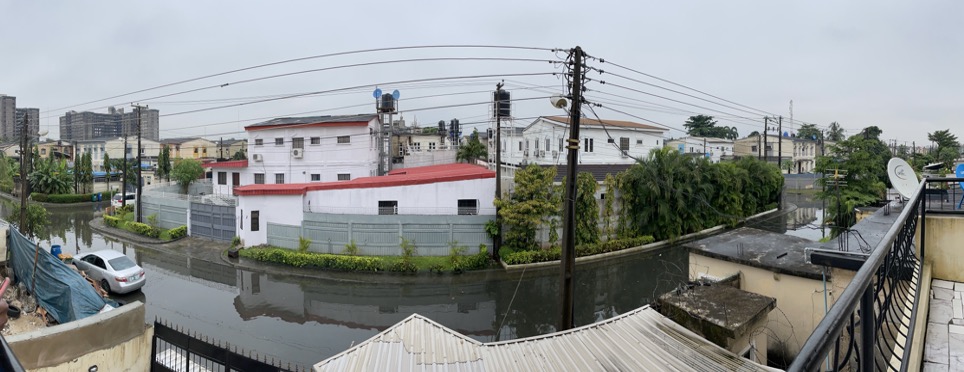 The thin dark line that traces the horizon in the photo is the reclaimed land on which the yet-to-be-built districts of Eko Atlantic will rise, and it runs along most of the horizon that could be seen from the beach. There is a lot of debate on the coastal protection structures of Eko Atlantic and whether they operate at the expense of increased environmental vulnerability of other coastal communities of Lagos, but the technical arguments and assessments completely defeat my capacity to form my own critical opinion of it. However, the flooding problem to which the city is prone is self-evident. It doesn’t take more than a few days of casual conversation with anyone really to pick up on a regular pattern of talk about floods—which people have gotten used to living around, but which they understandably won’t stop complaining about. On the two mornings of our field visits to the lagoon waterfront communities of Bariga and Makoko, the community members who received us referred to the same alleys and walkways that we were treading that very moment as being under half a meter of water only a few hours earlier. It is propagandistically easy and probably convenient for some—especially big global polluters—to point to the bad waste management practices of local residents as a concurrent cause of the floods. It is much less convenient to recognize to what extent anthropogenic climate change induced sea level rise is already damaging lives, properties, and ecologies in low-lying coastal communities—in Lagos, as much as elsewhere. The final water-based impression from the field trip came, appropriately, on the morning before our departure, when, as we pulled up the window shutters, the street looked back at us defiantly, completely submerged in water.