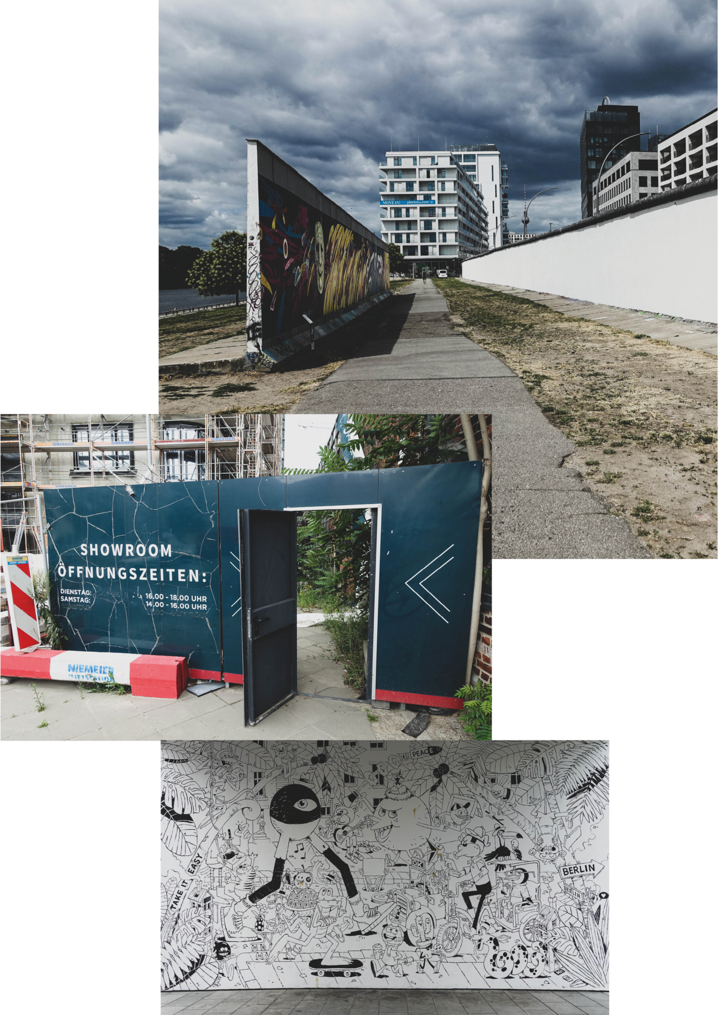 Mit Erreichen der ›East Side Gallery‹ beobachte ich von der gegenüberliegenden Seite das Gedränge zahlreicher Menschen auf den schmalen Gehweg, um die Mauer zu ›erleben‹. Direkt daneben befindet sich ein moderner, kürzlich realisierter Hotelbau. Neben dem Fußweg, auf dem ich mich befinde, wurde unter einem Baum eine informelle Gedenkstätte eingerichtet. Daneben liegt, ohne sich die Mühe zu machen, einen privaten Raum im Öffentlichen zu produzieren, ein schlafender Mann. Ich folge dem Weg parallel zum Postbahnhof und begegne zahlreiche adrett gekleidete Personen sowie Bauabeiter:innen, flankiert von eingezäunten Brachflächen. Zwei Männer echauffieren sich über einen Abfallberg zwischen geparkten Fahrzeugen. Der Baubetrieb bestimmt primär meine Wahrnehmung. Vor mir steigt der ›Spreeturm‹ empor neben dem im Bau befindlichen ›Upside Berlin‹: Ein Zwillingsturm-Bauprojekt, welches die neu produzierte Skyline an der Spree mitgestalten möchte und sich zu den anderen Hochhäusern der Mediaspree gesellt. Das Verkehrsbegleitgrün ist mittlerweile durch Pflaster abgelöst worden. An der Hochbaustelle befindet sich ein kleines Café, welches zur Mittagszeit gut besucht ist. In einiger Distanz sehe ich die gebietsdefinierende und bereits umbenannte Mehrzweckhalle: ›Mercedes-Benz Arena‹. Ein direkter Durchgang ist nicht möglich, die bildhaften wie belebten Zukunftsimaginationen der Architekt:innen, sogenannte ›Renderings‹ – mittels Computer synthetisierte Bilder auf Grundlage von Modellen/Entwürfen versprechen mir diesen aber in der Zukunft. Ich folge dem Straßenverlauf und finde mich am Rummelsburger Platz wieder: Ein Anwohner führt seinen Hund auf dem verdorrten Grün an der mehrspurigen Straße aus. Die Wohngebäude wirken bezogen, doch Namen auf den Klingelschildern sucht man vergeblich. Gegenüber befindet sich die East Side Gallery im ›Fluss‹ mit zahlreichen Tourist:innen(-gruppen). Diese interagieren angeregt mit der Berliner Mauer: sie posieren, fotografieren sie, berühren sie und kommunizieren. Ein plötzliches Loch kragt in der East Side Gallery und ich erinnere mich an die Proteste, die das Bauprojekt ›Living Levels‹ auslöste. Das Bauvorhaben auf dem ehemaligen Todesstreifen versetzte die Mauersegmente, um eine erschließbare Adresse zu erhalten. Damals empfand ich es nicht derart skandalös, jetzt irritiert es mich umso mehr. Die Macht des Geldes versetzt offenbar (historische) Mauern.