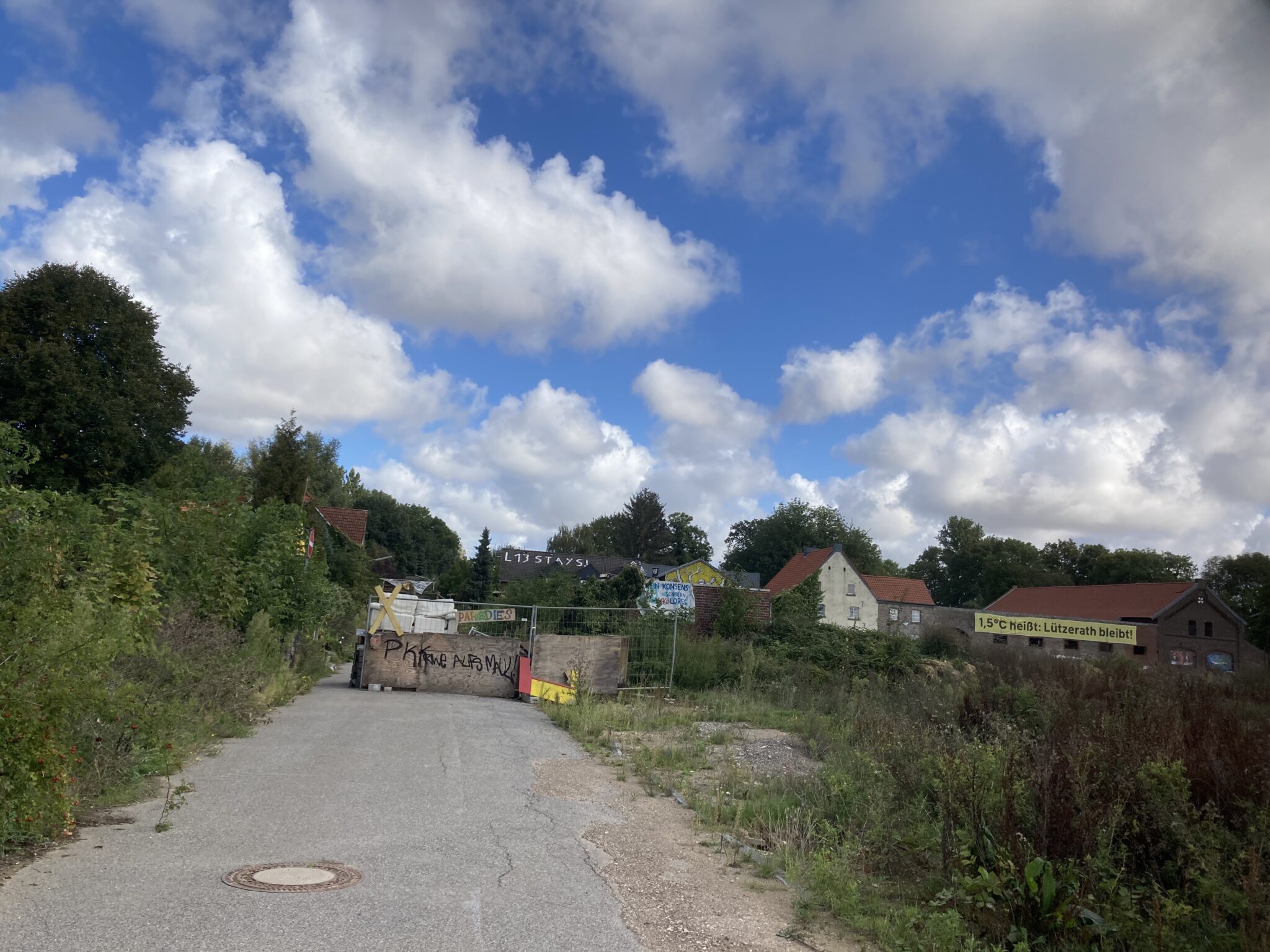 Walking along one of the village’s main streets, we reached the pit on the other side of what was once L277, once again demonstrating the omnipresence of the pit and its proximity to village life. This may be one of the reasons why the village, mostly empty of people, was still full of symbols of the climate justice movement. Signs from local movements, such as Alle Dörfer Bleiben (All villages stay), and Menschenrecht vor Bergrecht (Human rights before coal law), were accompanied by small signs from the transnational movement Fridays for Future.