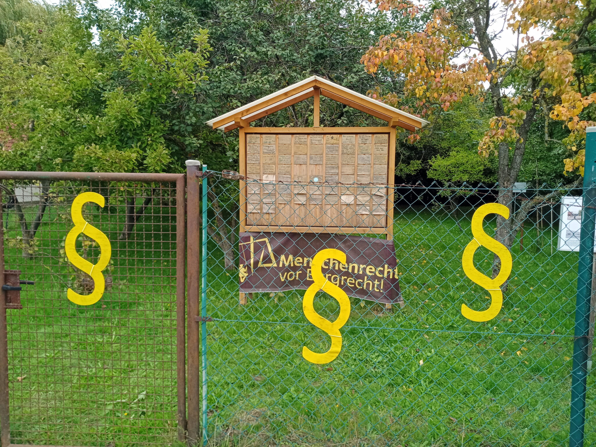 The sense of emptiness was intensified by the empty shops. A few shops, which in such villages usually serve as places of public life, a butcher and a greengrocer, were closed. The church building, another place of public life, was physically intact. Yet, its locked doors did not promise much. The only shop that seemed to be open was the bakery across the street from the church. Its windows were full of statements about the planned eviction (including criticism of the church), despite the decision having been reversed.