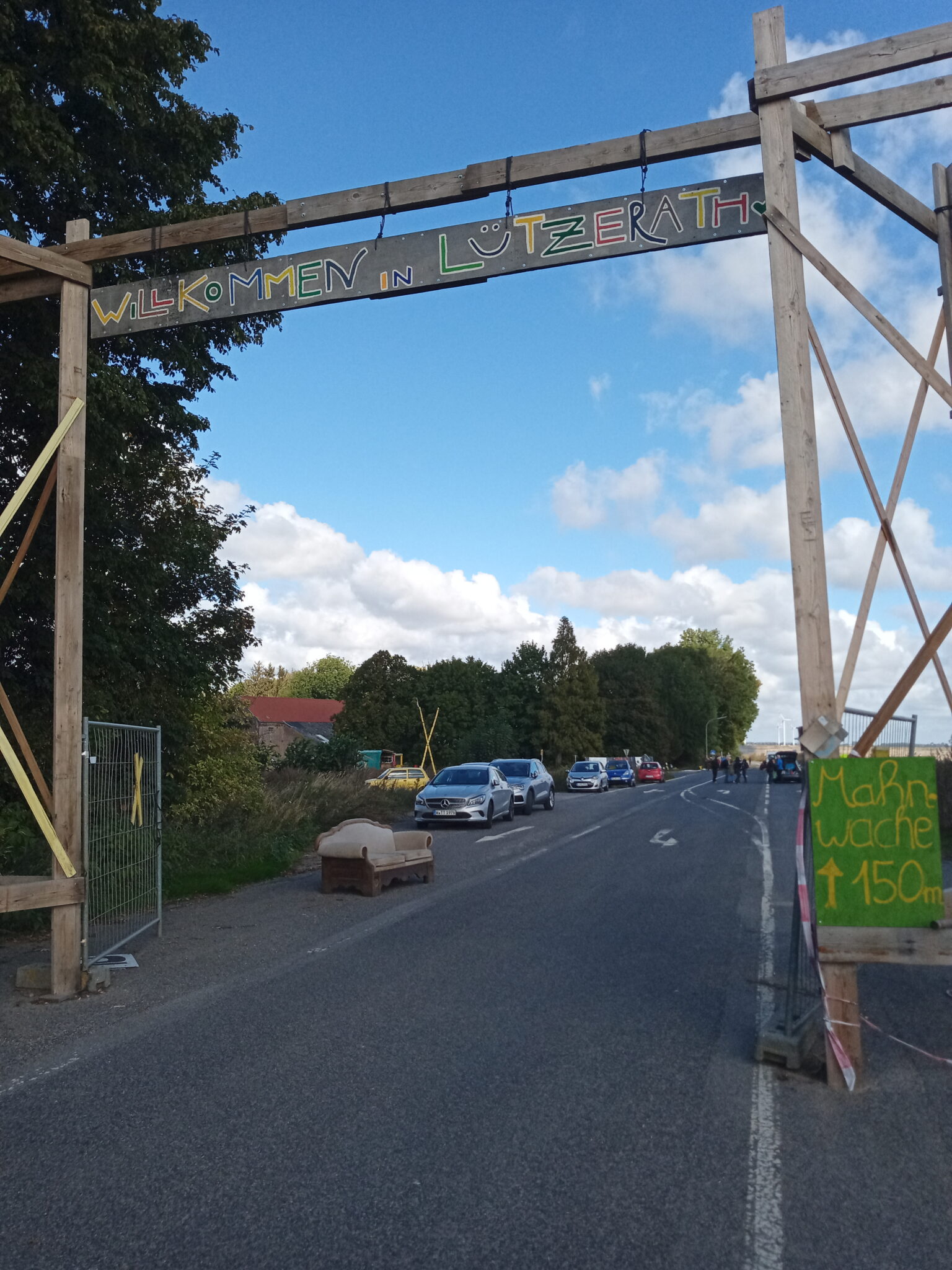 If one were to draw a mental map of Lützerath at that time, one could start from its “borders”. What remained of the village – a farmhouse and a few other houses and streets – was surrounded on one side by a road (L277) separating it from the mining area, and on the other side, by agricultural land. This area was surrounded by barricades and huge wooden structures that acted as gates. When we “entered” the village through the barricades, these structures also seemed to serve as watchtowers: an armchair on top of the barricade conjured up the image of someone keeping watch, in case the police or the security company hired by energy giant RWE approached the village.