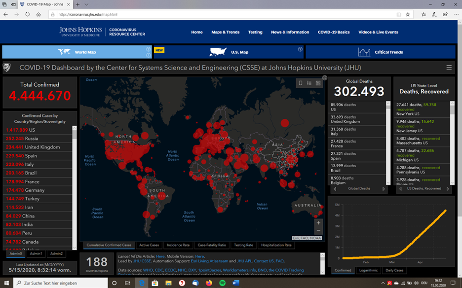 Research in this type of thinking diffusion is mostly comparative and based on aggregated quantitative data reducing history “to ‘chunks’ of data that can be objectified and measured” (Djelic 2008:10). It is precisely this “diffusion as epidemiology” that operates in the mapping of the corona virus by the Johns Hopkins University counting the total number of confirmed cases, deaths and recoveries for all countries across the globe (see screenshot above). Here, the underlying translation mechanism is equivalence construction between contexts. In counting cases of infection, death and recovery across the globe, all infected, dead and recovered bodies are seen as equivalent, although in some cases of infection, for example, the SARS-CoV-2 virus has not caused a COVID-19 illness; in other cases deaths are counted as caused by COVID-19 because the bodies have been tested positively, although these people clearly had additional co-mortalities. The classification practices thus open a space for various politics of translation through which governments try to control the official infection and mortality rates. There are, for example, large doubts about the numbers in Russia, where pneumonia-related deaths have largely increased without COVID-19 confirmations. And China in particular is said to highly control its mortality and infection rate. Counting urns in Wuhan, some have even estimated a total of 46,800 deaths in Wuhan alone.[10] Producing “just the right numbers” is important for national and transnational governmentality to produce compliant national populations on the one hand, and export one’s own model of governance as superior to the rest of the world’s on the other. While very low numbers might cause skepticism and a loss of trust in the national government, large numbers could reveal misgovernment and a failure to address the crisis properly.