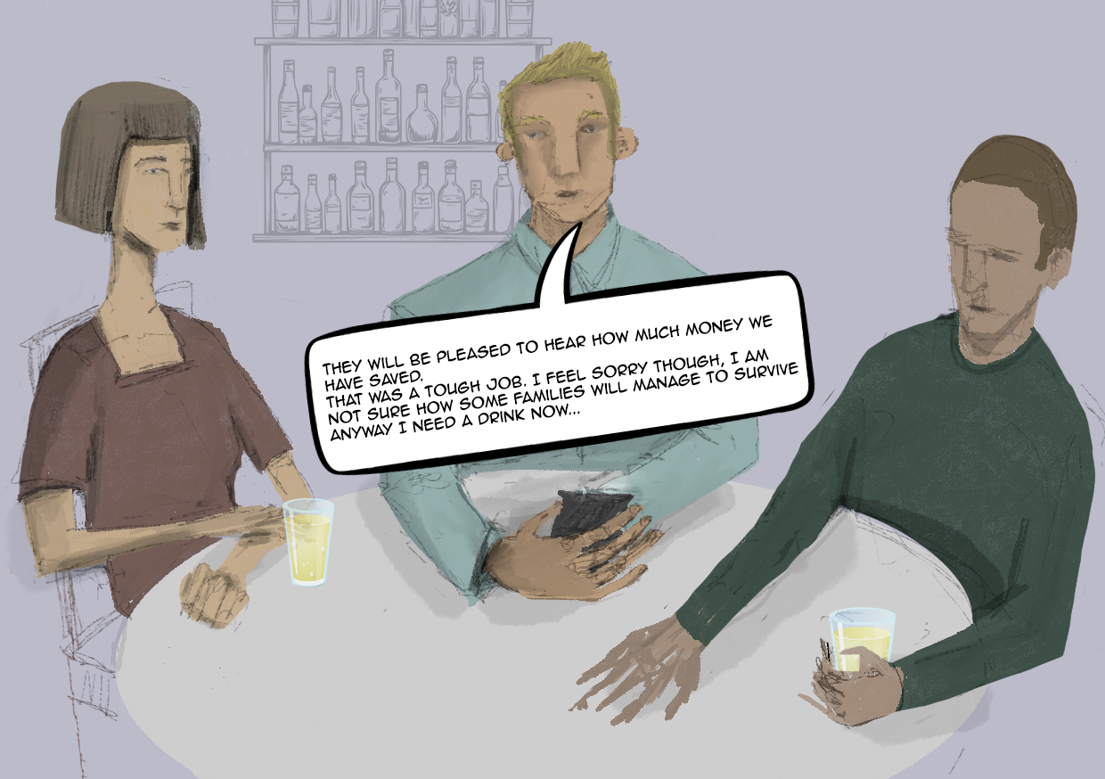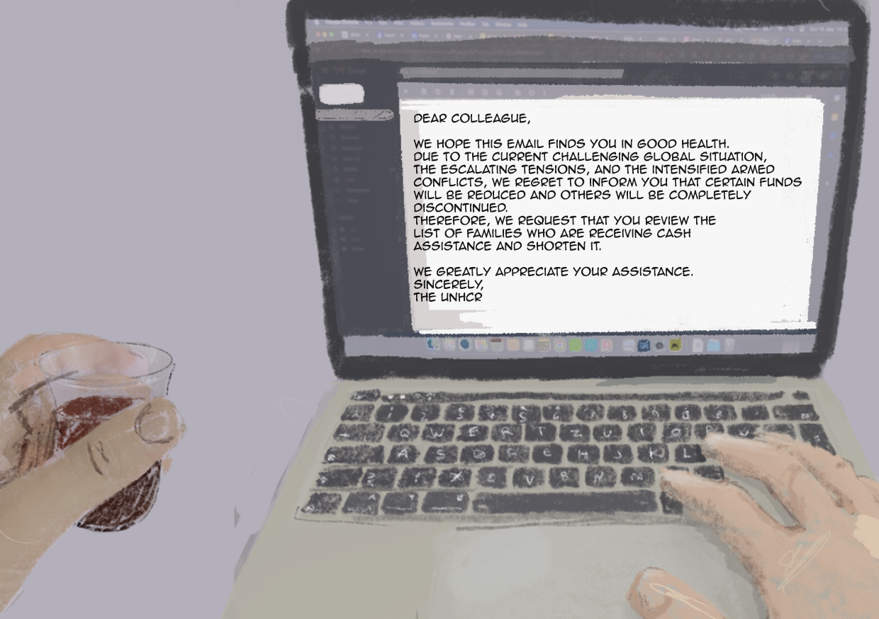 The initial illustration shows an imagined scenario involving a person employed by UNHCR who receives an email regarding policy changes due to the global crises. The refugees shared this experience in the workshop, after being asked why their funds were being reduced or stopped completely.