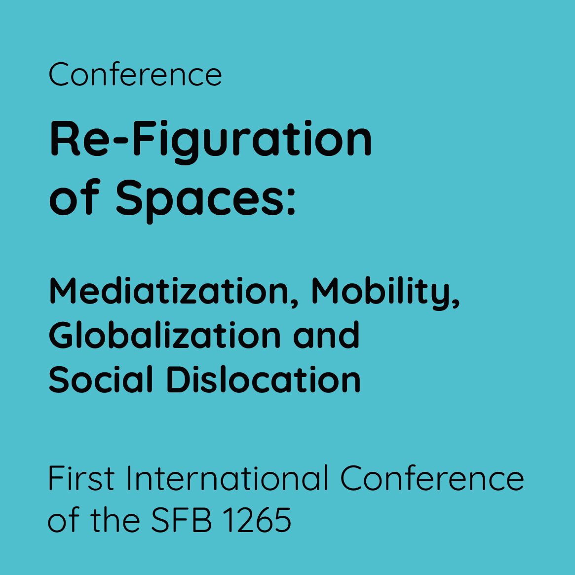 The collaborative research center “Re-Figuration of Spaces” at Technische Universität Berlin investigates changes in contemporary spatial arrangements with an emphasis on digital technologies and transnationalization. The goal is to determine the characteristics of the so-defined “re-figuration of spaces”. In order to achieve it, we examine a variety of subjective spatial experiences and knowledge production practices. This includes a more thorough examination of how emerging spatial structures are conditioned by increased interconnectedness of places and the circulation it implicates. Our conference thematizes how spaces change through mediatization, increased mobility, globalization and social dislocation. We ask which forms of arrangements, spatialities and materialities underwrite these processes. How are spaces negotiated and (visually) communicated? These questions will be addressed by international lecturers and discussed in plenary and parallel sessions.