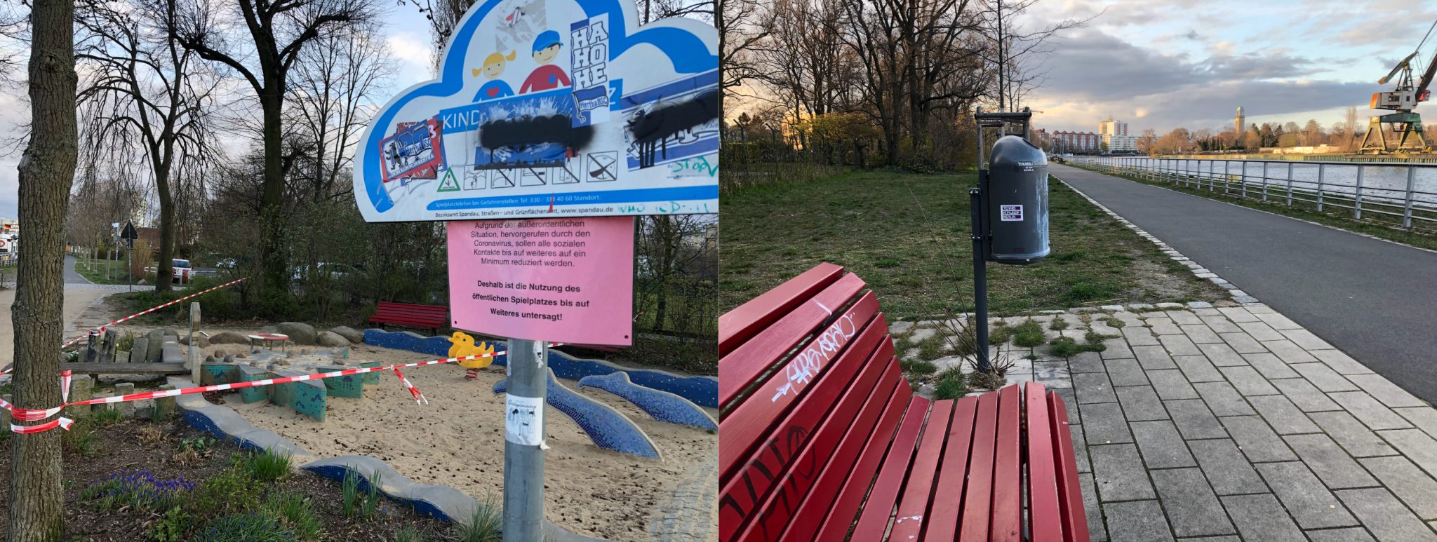 Waren die Tage und Abende zuvor noch belebt und mit Gelächter begleitet, so wirkt meine Straße nun kalt und leer. Dies ist aber nicht das einzige Beispiel. Auch als ich die Promenade an der Havel entlang schlenderte, war diese leer und verwaist. Nicht nur Spielplätze waren abgesperrt, sondern auch der Weg, welcher einen Kilometer bis zum Rathaus Spandau führte, war kaum besucht. Wenn ich auf Leute traf, musste ich ihren stechenden und fast fragenden Blicken (‚Was machst du draußen?‘) ausweichen (Abb. 3).