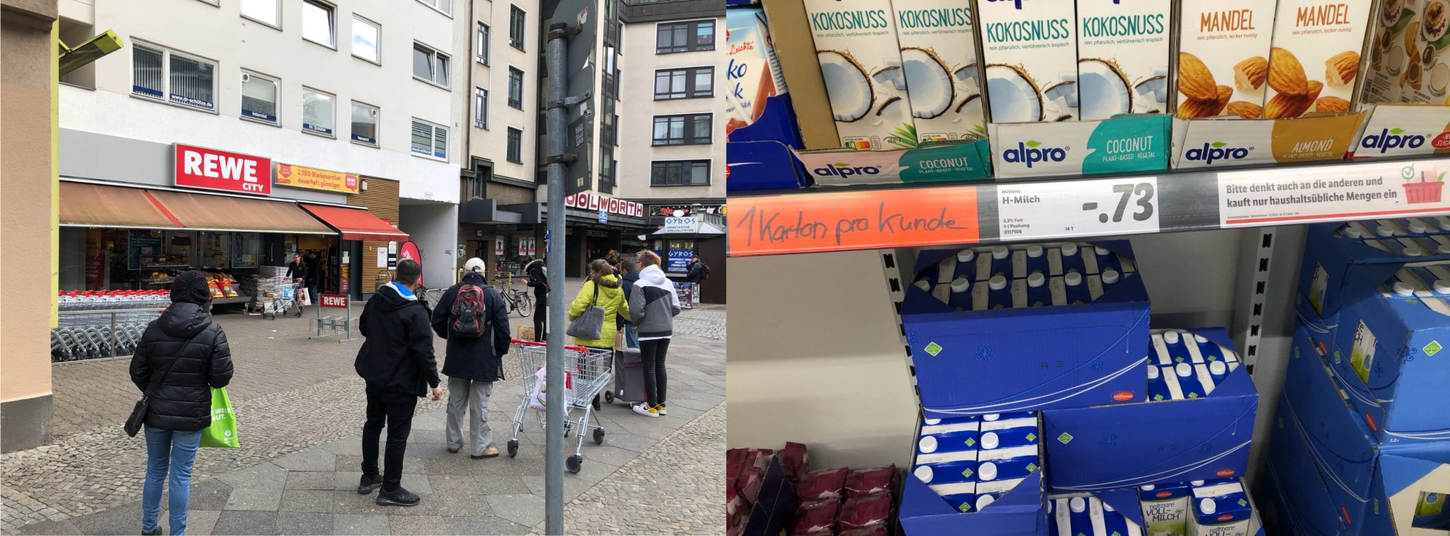 Aber nicht nur der ‚leere‘ Raum war neu. Auch die Begegnungen mit Menschen veränderten sich. Waren vorher die Interaktionsordnungen bei alltäglichen Dingen, wie Einkaufen, relativ eindeutig, so bedingte die räumliche Neu-Ordnung im Supermarkt auch eine Veränderung der Interaktionsordnungen. Um die Hygienemaßnahmen umzusetzen, wurden zu bestimmten Zeiten nur eine bestimmte Anzahl an Personen durch Ordner in einen Supermarkt gelassen, was zu Schlangenbildungen vor den Eingängen führte. Warnschilder an den Produkten gaben Hinweise auf eine untereinander geforderte Solidarität (‚Bitte denkt auch an die anderen‘) (Abb. 4).