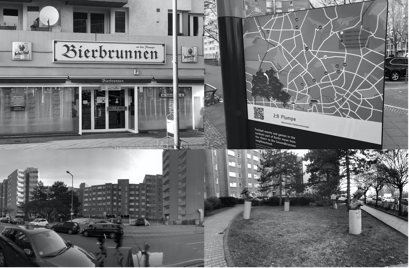 Die Wirkung unterschiedlicher Kontexturen (Teilung Berlins, Neuordnung der westdeutschen Fußballliga, drohende Zahlungsunfähigkeit) waren es also, welche den Verein zum Notverkauf der »Plumpe« an die Stadt Berlin zwangen. Nicht einmal ein Abschiedsspiel konnte ausgerichtet werden[24], sodass das Stadion im Jahre 1974 für zusätzlichen Wohnungsbau abgerissen wurde. Heute sind nur noch Verweise an Gebäuden (»Bierbrunnen an der Plumpe«) und Gedenktafeln zu sehen, welche sichtbar machen, dass hier mal der »Zauberberg« der Hertha stand (Abb. 2).