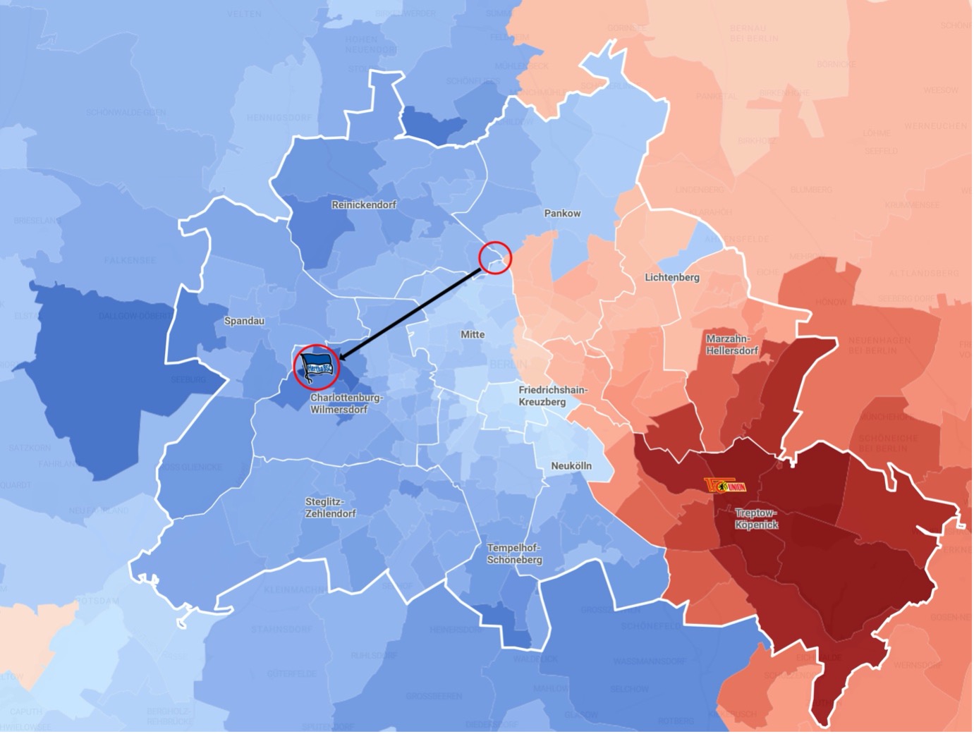 Beraubt des eigenen Stadions und Stammkiezes „Wedding“ musste Hertha BSC eine neue »Heimat« finden, welche bis heute der Bezirk Charlottenburg-Wilmersdorf ist, was aber große Teile der eigenen Anhängerschaft damals als »Verrat« begriffen[25]. Denn dieser Umzug durchtrennte Beziehungen und verwandelte das Kollektiv von Hertha BSC in ein Kollektiv auf der Suche nach sich selbst, seinem sozialen Konnex entrissen und auf ganz Westberlin nun verteilt, wie auch heute noch eine Karte der Berliner Morgenpost über die Verteilung der Mitglieder*innen von Hertha BSC und dem FC Union Berlin in den Berliner Bezirken zeigt. (Abb. 3).