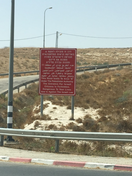 Ich lande in Tel Aviv und werde von dort nach Ramallah gefahren. Auf dem Weg lerne ich die Grundlagen des hiesigen Straßenverkehrs: es gibt zwei unterschiedliche Autokennzeichen – die gelb-schwarzen israelischen und die weiß-grünen palästinensischen. Die Straße, auf der wir sind, darf man nur mit einem gelben Kennzeichen befahren. Irgendwann passieren wir ein rotes Schild, dreisprachig beschriftet: „This Road Leads To Area A / Under Palestinian Authority / The Entrance For Israeli / Citizens Is Forbidden, / Dangerous To Your Lives / And Is Against The Israeli Law.“ Okay, denke ich, einschüchternd, aber so einfach ist das also. Ich hatte Kontrollen durch Polizei oder Militär erwartet, Checkpoints, und merke jetzt: diese Grenze ist überraschend offen, durchlässig. Niemand kontrolliert, ob ein israelischer Bürger in diesem Auto sitzt und gegen das Gesetz verstößt.