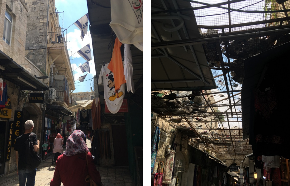 In Jerusalem selbst dann begegnet mir die Anordnung von Oben und Unten auf kleinerer Skala: Wir laufen durch die Gassen der Altstadt, vorbei an vielen Geschäften, der Via Dolorosa, dem Geburtsort der Jungfrau Maria, zahllosen Touristen. In einer Straße hängen im zweiten Stock israelische Flaggen an den Balkonen, an den unteren Balkonen hängt nichts, nur Wäsche zum Trocknen. Wer wohnt hier? Gibt es Konflikte im Treppenhaus? Später ist ein Abschnitt einer Straße in drei Meter Höhe komplett mit einem Metallgitter bedeckt. Ich frage nach: Oben wohnen israelische Familien, unten sind arabische Geschäfte. Das Gitter dient als vertikale Abgrenzung, von oben wird Abfall runtergeworfen: leere Flaschen, Zigarettenschachteln, benutzte Windeln. Lässt sich das einordnen im Sinne einer vertikalen (Mikro)Politik, in der die Oberen ihren Müll auf die weiter unten werfen, oder ist es einfach Nachlässigkeit? Soll das Gitter schützen – wenn ja, wen? – oder die Abgrenzung markieren? Ich frage mich, ob auch dieses Gitter der (Über)Ordnung, Dominanz und Überwachung dient.