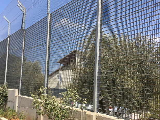 Ich rede kurz mit dem Besitzer des Grundstücks: Wie lange wohnt er hier schon? Schon immer, er ist hier aufgewachsen, hat das Haus von seinen Eltern übernommen. Wie ist das, hier zu wohnen? Die Siedler werfen manchmal Steine rüber, erzählt er, rufen und schreien. Und das gelbe Tor an der Einfahrt und die Kameras? Das Tor wird manchmal geschlossen, dann kann die Familie nicht rein oder nicht raus, je nachdem. Die Kameras sind ihm egal, er macht ja nichts Verbotenes, er wohnt hier einfach mit seiner Familie, ganz normal. Ob er schon mal darüber nachgedacht hat wegzugehen, frage ich. Er lacht – nein, natürlich nicht, das ist sein Zuhause. Ich schäme mich ein bisschen für meine Frage und bin gleichzeitig überrascht über die Antwort. Wie ich überhaupt überrascht bin darüber, mit wieviel Gleichmut hier viele der Situation des permanenten Ein- und Ausgegrenztseins begegnen. Ist das nur meine Sichtweise und blende ich vielleicht vieles an Ärger und Aggression aus? Möglich. Aber das Aushalten, das Bleiben, das Verweilen auf Grund und Boden und das Beharren auf das eigene Zuhause erscheint mir als subtile, alltägliche Form des Widerstands gegen die Zersplitterung, Verdopplung und Besatzung des Raums.
