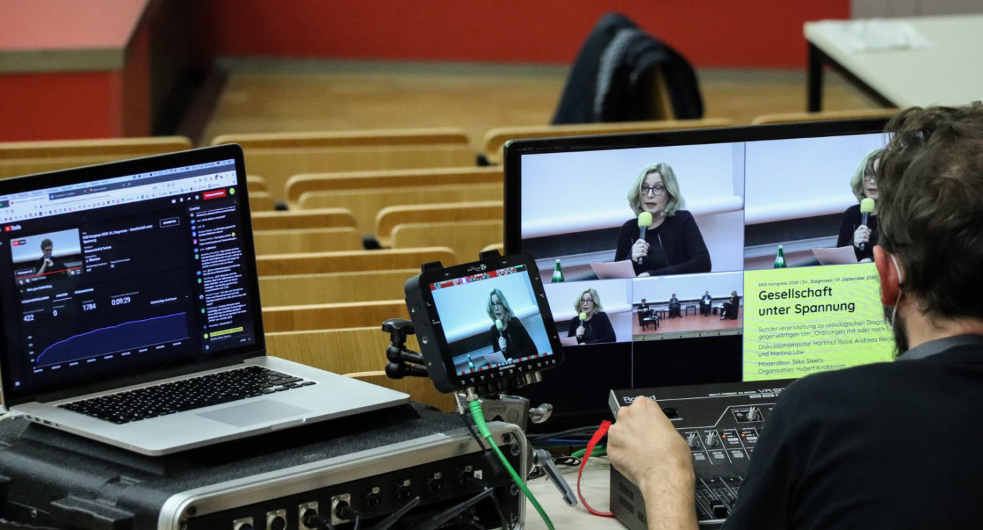 Die Frage danach, was die Soziologie als Wissenschaft zu leisten vermag, aber auch was sie in Anbetracht gesellschaftlicher Entwicklungen können müsste, wie schon im Hintergrund von Séverine Marguins Vortrag angedeutet, leitete auch die zweite Veranstaltung des SFBs 1265 im Rahmens des diesjährigen DGS-Kongresses ein. Am Abend des 17. September 2020 fand die einzige Präsenzveranstaltung der Konferenz im großen Hörsaal der TU Berlin statt. Auf Grund der Corona-Auflagen war die Zahl der vor Ort Teilnehmenden zwar auf ca. 25 Personen begrenzt. Gleichzeitig verfolgten jedoch bis zu 400 Interessierte über den YouTube LiveStream die Impulsvorträge von Hartmut Rosa (Friedrich-Schiller Universität Jena), Andreas Reckwitz (HU Berlin) und Martina Löw (TU Berlin) sowie die anschließende Podiumsdiskussion. Die von Hubert Knoblauch (TU Berlin) organisierte und von Silke Steets (FAU Erlangen) moderierte Sonderveranstaltung stand unter dem Titel „Gesellschaft unter Spannung – Sonderveranstaltung zu soziologischen Diagnosen der gegenwärtigen Um_Ordnungen mit oder nach Corona“ und fokussierte entsprechend das diagnostische Potential der Soziologie. Dabei ging es in der Gegenüberstellung der unterschiedlichen gesellschaftstheoretischen Überlegungen der einzelnen Diskutant*innen nicht nur um die Analyse einer Gesellschaft, die sich mit einer global verbreiteten Pandemie konfrontiert sieht, sondern auch um eine Reflexion über die Möglichkeiten, Ansprüche und Begrenzungen soziologischer Zeitdiagnosen im Allgemeinen – einer, wie Silke Steets dies formulierte, „Soziologie der soziologischen Zeitdiagnose“.