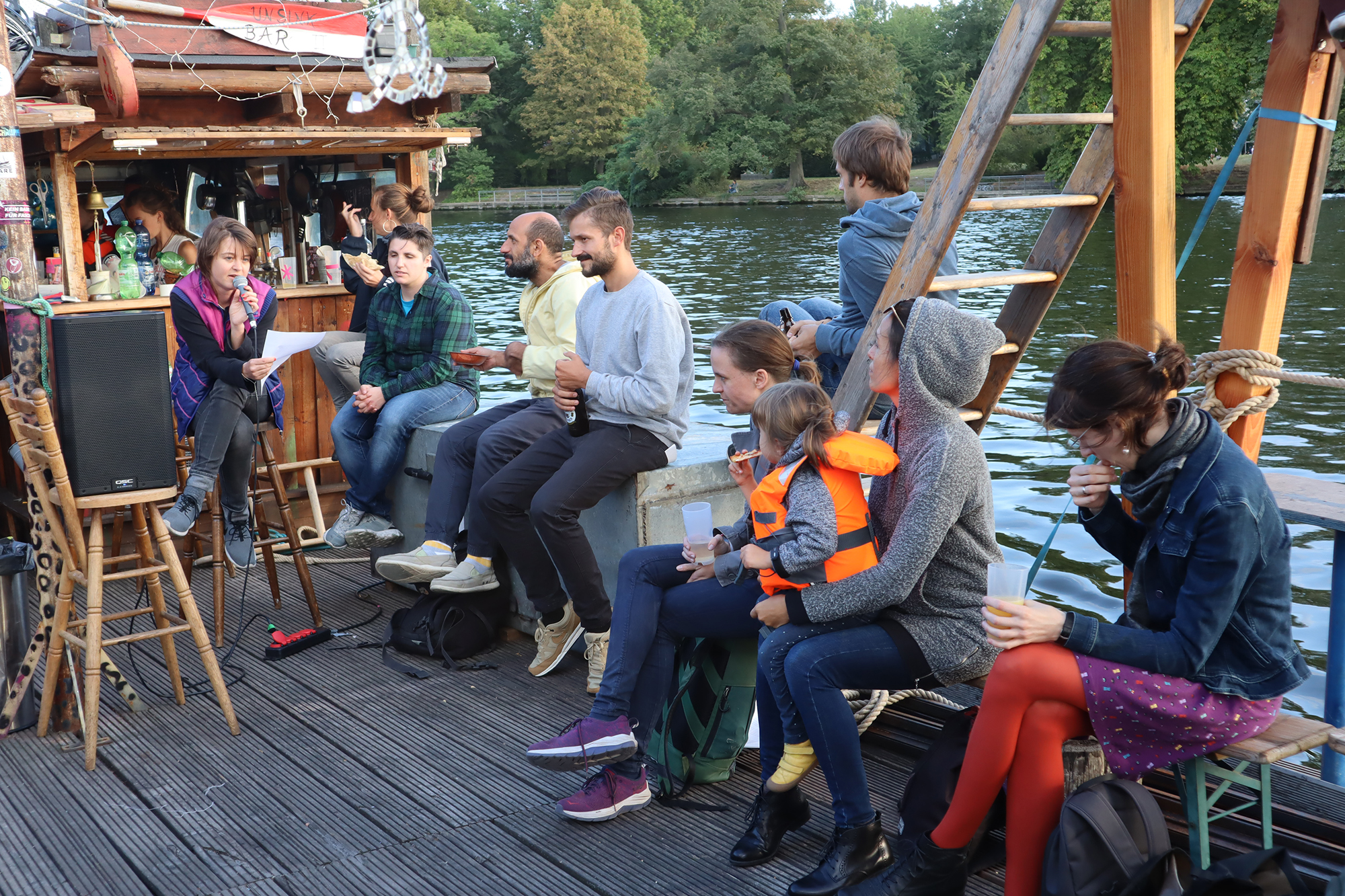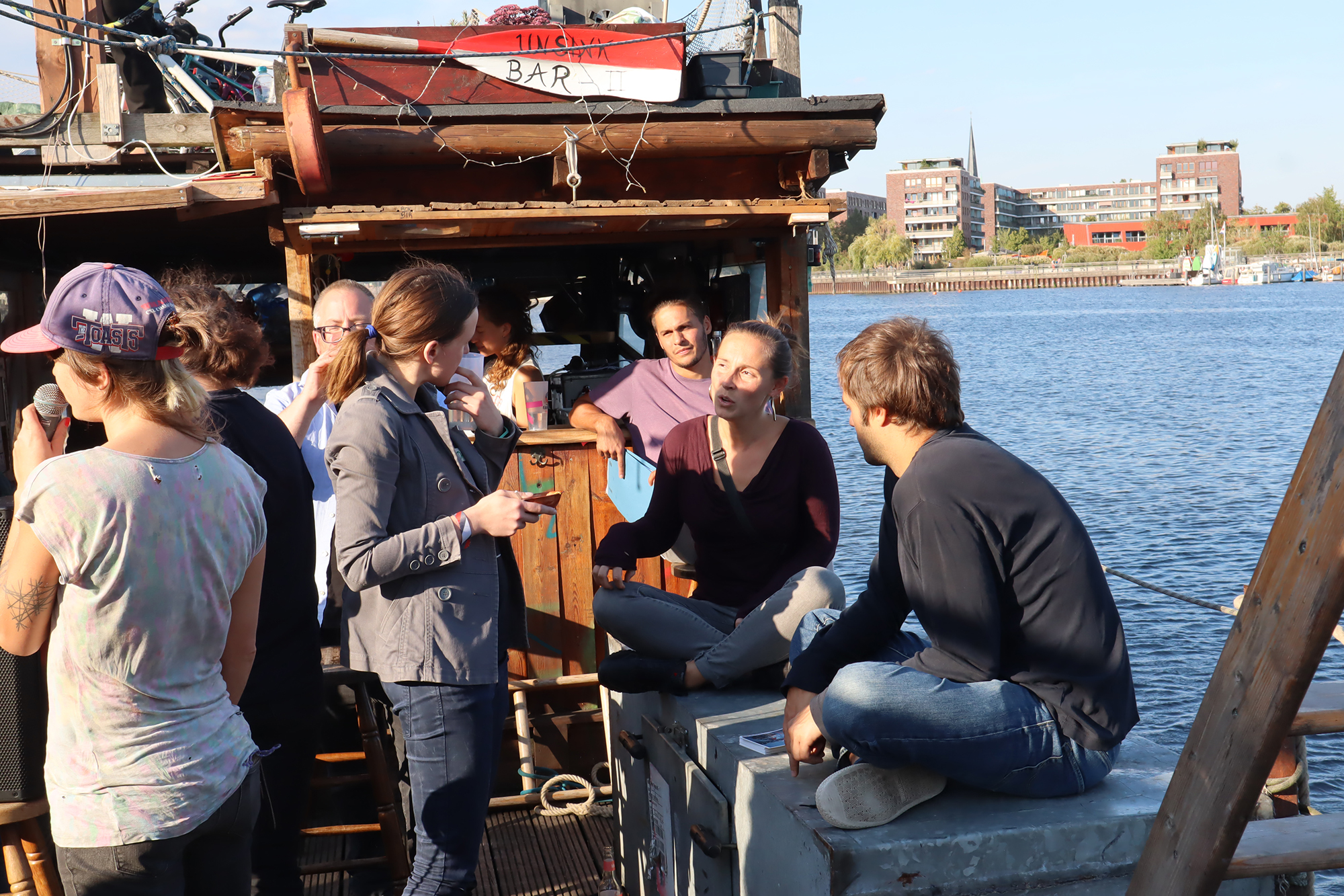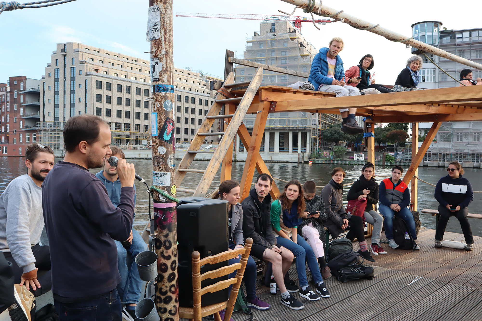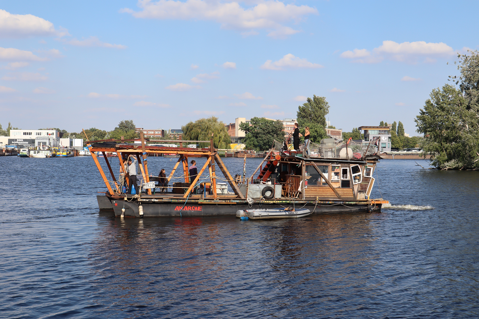 Afterwards, we made our way to the first highlight of our summer school: A boat tour with the Anarche, a self-built and collectively operated raft. During the trip, the participants could get to know various places of urban conflict and resistance in Berlin from the river Spree. Janina Dobrusskin, Valentin Domann, Sebastian Hilf and Paul Welch Guerra, reported on the history and construction of the Anarche itself, how it´s history entwines with past and current conflicts in and around the bay area of “Rummelsburger Bucht”, on the emergence of the “Holzmarkt” project and on the history of the brown fields and squats of “Cuvry-Brache” and “Teepeeland”.